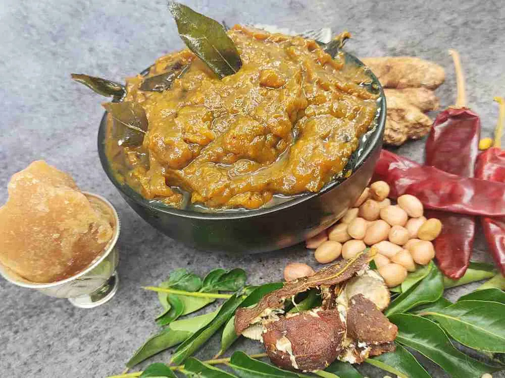 A tangy tamarind paste blended with groundnuts, spices, and jaggery for authentic pulihora in minutes.